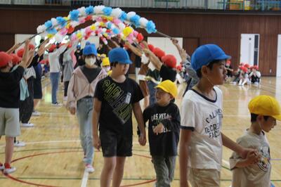 1年生と6年生が手をつないで、5年生がつくったアーチをくぐり、2・3・4年生の温かい拍手の中、入場しました。