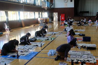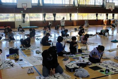 今日は、4年生が書初めの練習を体育館で行いました。「太よう」という文字を書いていました。手本をよく見て、いい作品になるように集中して取り組んでいました。