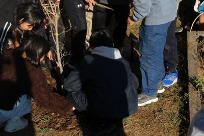今日の植樹式は、すべて6年生が進行を考えました。実行委員の子どもたちが穴を掘り、校長と教頭が、みんなのカウントダウンに合わせて木を穴に入れました。次に、実行委員の子どもたちが穴の中にたっぷりと水を注ぎ、みんなで土をかぶせていきました。記念樹のプレートは、6年生の担任の先生2人がカウントダウンに合わせて土に差し込み、最後は校長のテープカット(ここでもカウントダウン)で植樹式が無事に完了しました。実行委員の子どもたちが一生懸命考え、準備したことがしっかりと伝わり、微笑ましい気持ちになりました。