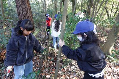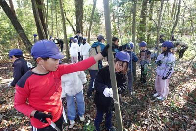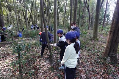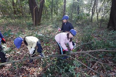 全員がのこぎりを持ち、4人ほどのグループで協力して活動しました。実際に生えている木をのこぎりで切るのは難しく、グループの仲間と交代しながら繰り返し、のこぎりを引いていました。子どもたちが協力してやっと木を切れた時には、大きな達成感を味わっていました。