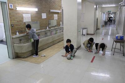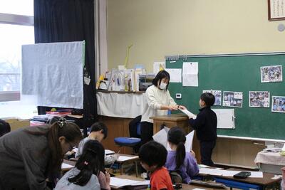 教室に戻った後は、先生から通知表を受け取ったり、2学期の振り返りをしたりしていました。先生が一人一人に通知表を見ながら、頑張った点などを伝えてくれて、子どもたちが嬉しそうにしている様子も見られました。中には、掃除を一生懸命にして、真っ黒になった雑巾を見せてくれた子もいました。
