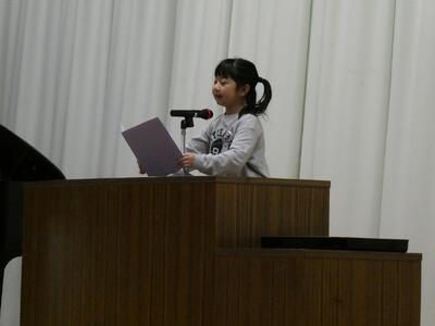 その後、2年生の子どもたちが児童代表として言葉を述べました。この発表が2年生とは思えないほど堂々としていて、内容も素晴らしかったです。音楽会や算数の九九を頑張ったことを話してくれました。