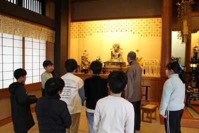 途中、本堂の見学ツアーがあり、ご住職の色摩さんが、西富小学校や宝泉寺の歴史、薬師如来様や閻魔様についての説明をしてくださいました。また、今日は学校運営協議会の委員や地域の方々にも見守りのご協力をいただきました。ありがとうございました。