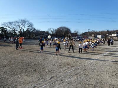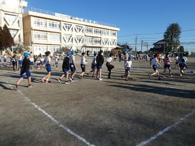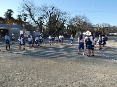 各学級2グループを作って長縄をします。2分間跳んで回数を計測して、2グループの合計回数を記録します。2月25日の体育朝会にもう一度計測するので、そこまで各学級で長縄に取り組み伸びを確認します。