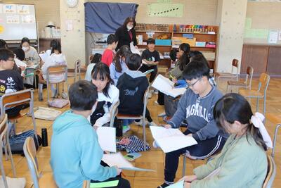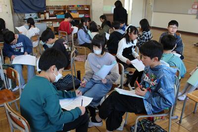 卒業式の歌「明日へつなぐもの」をどのように表現を工夫するとよりよくなるか、グループで相談している場面でした。歌の表現について考えるということは難しそうだと思いましたが、子どもたちは「ここにブレスを入れるといいよね」「ここはフォルテッシモだといいね」「笑顔のところは、表情も笑顔にするといいよね」「君の言葉に励まされてのところは、気持ちが伝わるようにていねいに歌うといいね」など、活発に意見交換していて、さすが合唱の表現力が素晴らしい西富小学校の子どもたちだと感じました。