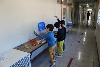 また、1年生は「スタートカリキュラム」として、登校後は遊びを通してリラックスしながら学校生活をスタートし、無理なく小学校生活に慣れていけるようにしています。コマ回し、あやとり、ブロック、ぬり絵、読書、読み聞かせなど、それぞれがやりたい遊びを楽しんでいました。