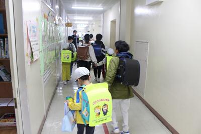 一斉下校の際には、班長が1年生の教室へ迎えに行き、はぐれないよう隣でゆっくり歩いたり、手をつないだりして移動していました。また、一斉下校では、校外役員の皆様をはじめ、保護者の皆様にも見守りをしていただき、ありがとうございました。