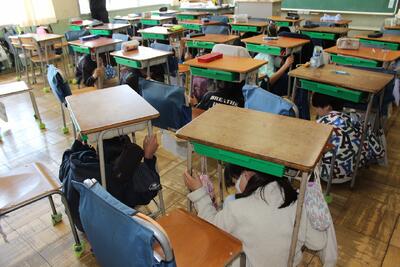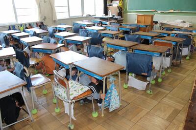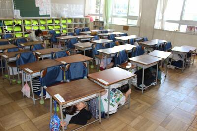 本日は避難訓練を行いました。雨天でもあったので、シェイクアウト訓練を行いました。