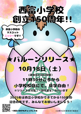 バルーンリリースのご案内ポスター 投稿: 校長 (09/04) 10月18日(土)に西富小学校創立150周年記念のバルーンリリースを行います。11時30分頃の実施を予定しています。西富小学校運動会と同日開催です。地域の方は見学自由ですので、一緒にお祝いしましょう。 150年ニッシーポスター.png